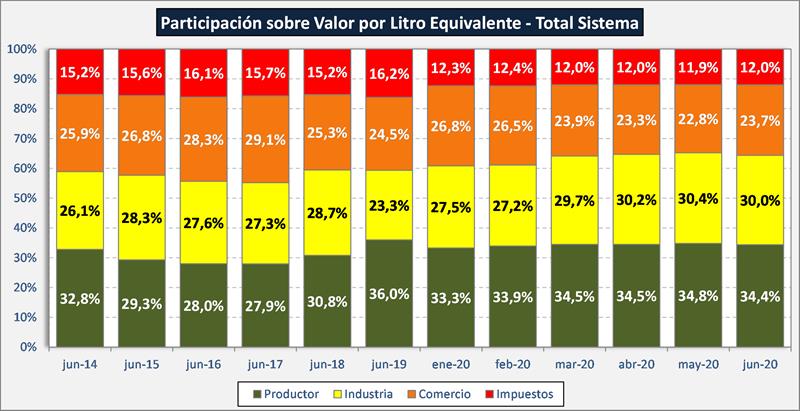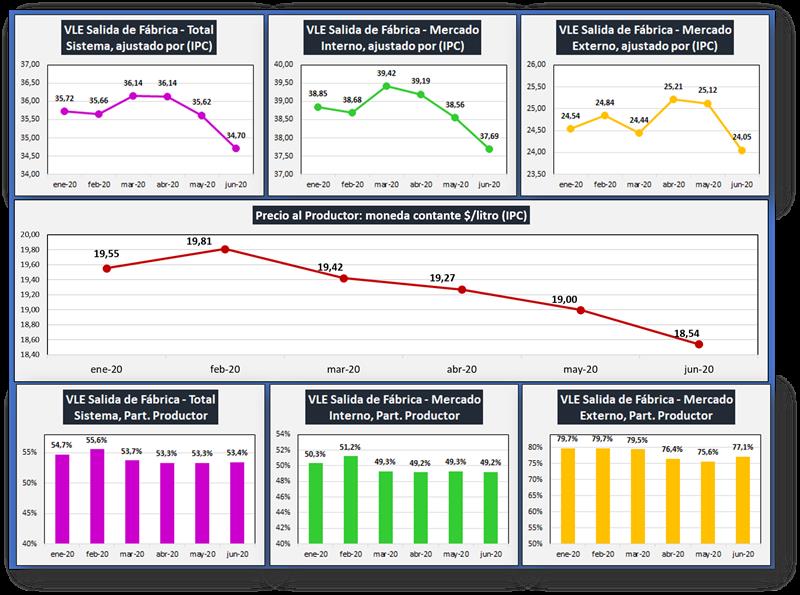 Participación del Productor y la Industria en el Valor de la Cadena 27/7/2020Sobre la base del análisis que mensualmente realiza el Instituto Argentino de Profesores Universitarios de Costos – IAPUCo que referencia la valorización en la cadena sobre el Valor por Litro de Leche Equivalente – VLE, se muestra en el siguiente gráfico el agregado de valor en cada etapa de la cadena en términos relativos de participación respecto al precio final total del sistema (mercado interno y exportación). ![]() Participación del Sector Primario ![]() La participación del productor en el total del sistema fue para junio del 2020 del 34,4%, 0,4 puntos por debajo del mes anterior (máximo de la serie en junio de 2019 con el 36,0%) y bastante por encima de la media del 30,2%. Un leve deterioro en la participación en los valores finales de mercado interno (0,5) y una mejora de 1 punto porcentual en el mercado externo. La participación del productor sobre el valor de salida de fábrica (precio al que vende la industria) fue de 53,4%, casi igual que el mes anterior (+0,1), y 1,2 puntos por encima de la media de la serie disponible, cabe recordar que la serie histórica para los valores de salida de fábrica tiene una mayor extensión temporal que el resto. Participación del Sector Industrial ![]() La industria cae en junio del 2020; 0,4 puntos su performance de participación en el mercado interno, también baja 1,3 puntos porcentuales en el mercado externo, y promedio ambos mercados con una baja del 0,4. Salvo en el mercado externo, las participaciones actuales superan a la media y están cercanas a los máximos valores. La facturación total de salida de fábrica por litro de leche equivalente está en US$ 0,50 (1 centavos menor que el mes anterior), 10 centavos por litro por debajo del promedio y 24 centavos menos que el máximo logrado en mayo y octubre de 2013, lo cual evidencia los problemas de competitividad que enfrenta el sector, fundamentalmente por el comportamiento de las variables económicas. Precio al Productor / Valor de Salida de Fábrica = Participación del Productor En los gráficos reunidos en la imagen de abajo, se compara la evolución del Valor de Salida de Fábrica (precio al que vende la industria cada litro de leche equivalente), en ambos mercados y promedio del sistema en moneda constante (ajustado por IPC), con el precio al productor, para determinar la evolución de la participación del productor en lo que va del año 2020, y tratar de evaluar los efectos que pueden haber tenido sobre los precios, la mayor producción de leche (9,3% en el semestre), los mayores stocks (25% más que año pasado), la pandemia/cuarentena y la situación del mercado doméstico (cambios en el consumo y poder de compra de la gente) y del mercado internacional (demanda, precios y tipo de cambio). ![]() elaborado por el OCLA con información de IAPUCo