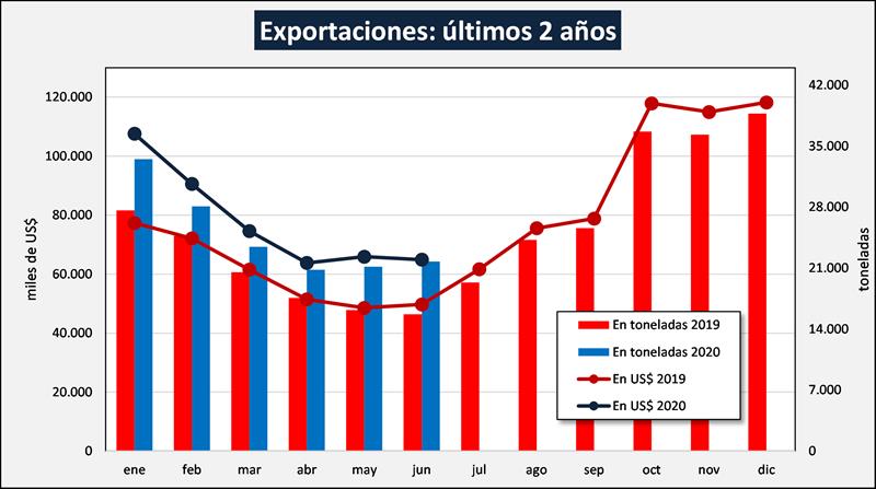 La variación intermensual de las exportaciones fue +2,8% en volumen y-1,5% en valor (jun/20 vs. may/20).