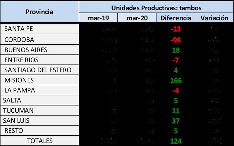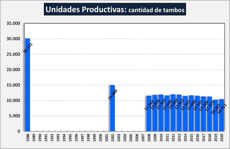 En este año se relevaron 10.411 unidades productivas (tambos), 124 más que el año anterior. En particular aparece como era de esperar una reducción de tambos en las Cuencas Tradicionales (100 unidades) por efecto de la concentración que venimos marcando, pero se da un incremento de 224 unidades en la Cuencas no Tradicionales (Misiones, San Luis, Tucumán, entre otras), que seguramente no provengan, en general, de unidades nuevas sino de que han ingresado al registro.