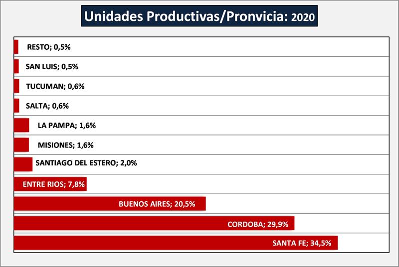 La distribución de tambos por provincia, marca una fuerte concentración en las Cuencas Tradicionales (Córdoba, Santa Fe, Buenos Aires y Entre Ríos), con el 92,7% de las unidades productivas, siendo Santa Fe quien presenta el mayor número de tambos (34,5%).