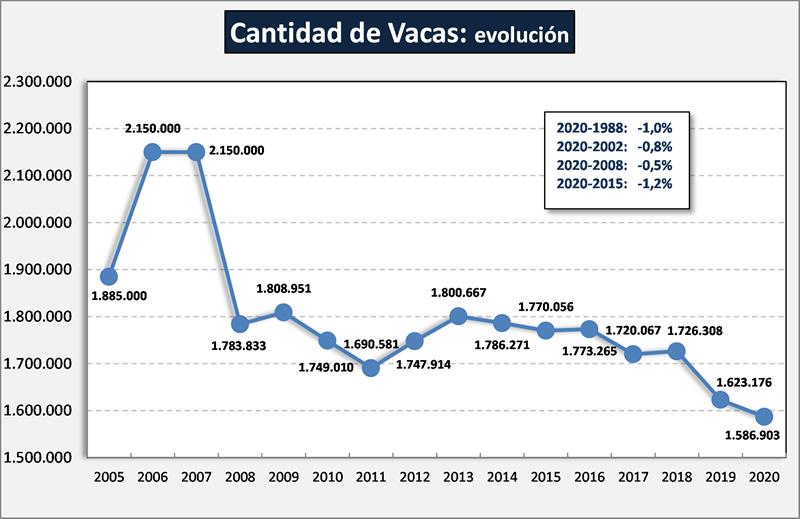 En lo que respecta al número de vacas en producción, en 2020 se relevaron 1.586.903 cabezas, esto representa una disminución del 2,2% respecto al año anterior y una tasa histórica de disminución del rodeo de vacas, del 1,1% anual en los últimos 15 años.