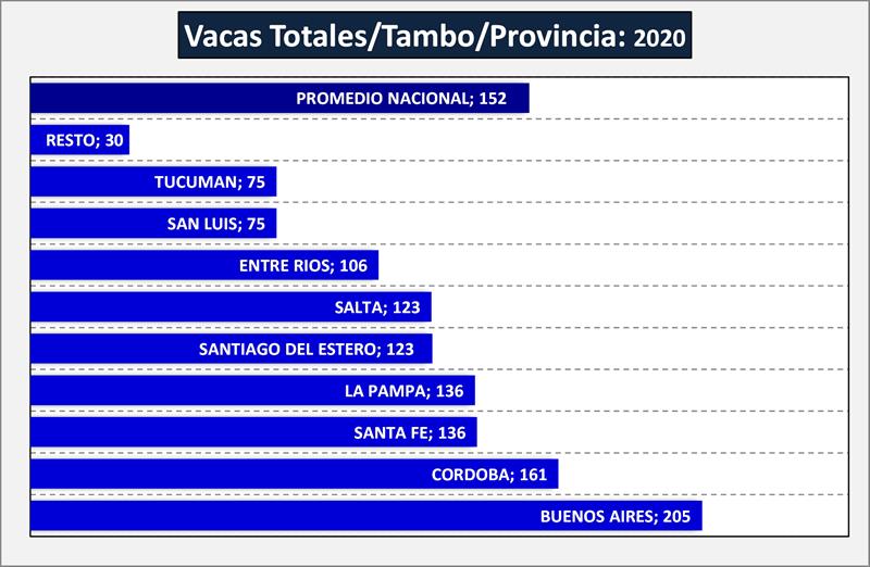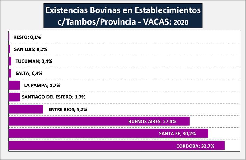 La distribución de vacas por provincia, marca también que en la Cuencas Tradicionales se concentra el 95,5% del rodeo lechero y pasa al primer lugar la provincia de Córdoba con el mayor número de vacas (32,7%), lo que la lleva a ser ésta la provincia con la mayor producción de leche de Argentina (+/- el 33%).