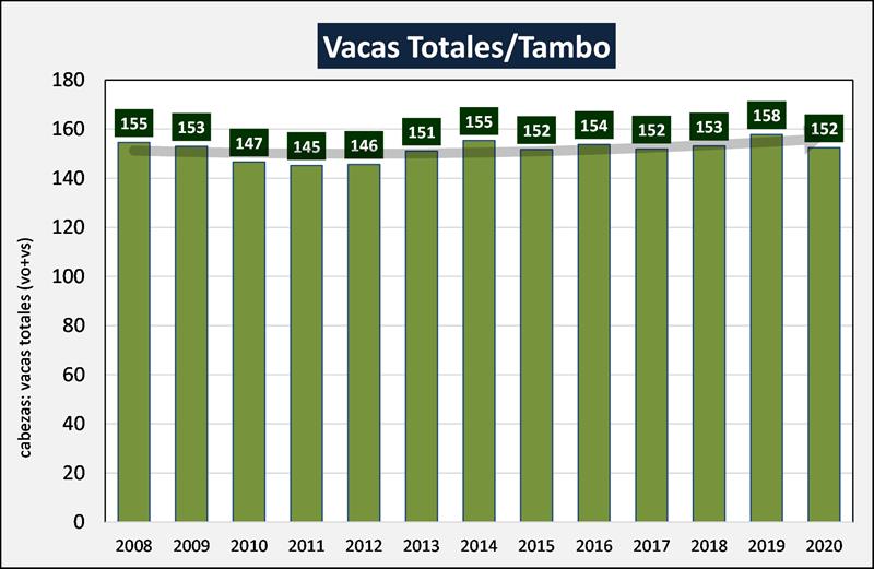 Relacionando la evolución de la cantidad de vacas con el número de unidades productivas, podemos llegar al análisis de la cantidad de vacas totales (en ordeño y secas) por tambo, que en los últimos 13 años tiene un promedio más o menos estable en 152 vacas totales.