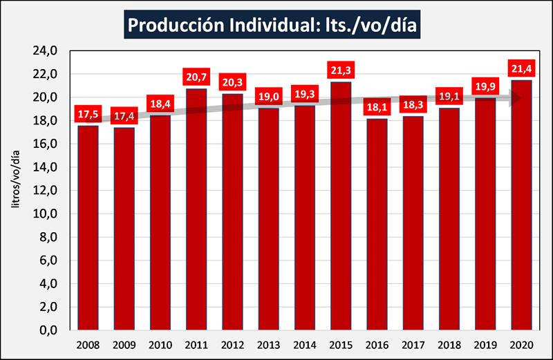 Por último, al vincular la producción total de leche y el número de vacas en ordeño en base al IEP, % de parición y relación vo/vt, para determinar los días de lactancia, con datos de diferentes fuentes, podemos obtener la evolución de la producción individual medida en litros de leche por vaca en ordeño y por día que para el 2020 nos arroja un valor de 21,4 litros, el más alto de la serie analizada (2008-2020) y con una tendencia de crecimiento anual del 1,7% desde 2008 y del 4,3% desde 2016.
