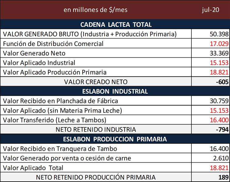 Luego de 16 meses consecutivos con resultados positivos, julio 2020 presenta un resultado negativo en la cadena de valor. El balance sectorial muestra un resultado negativo de $ 605 millones, aproximadamente $ 0,63 por litro de leche equivalente. Comparado con igual mes del año pasado el resultado se deteriora en $ 2.466 millones, ya que julio 2019 arrojó el máximo valor de resultado positivo de la serie disponible.