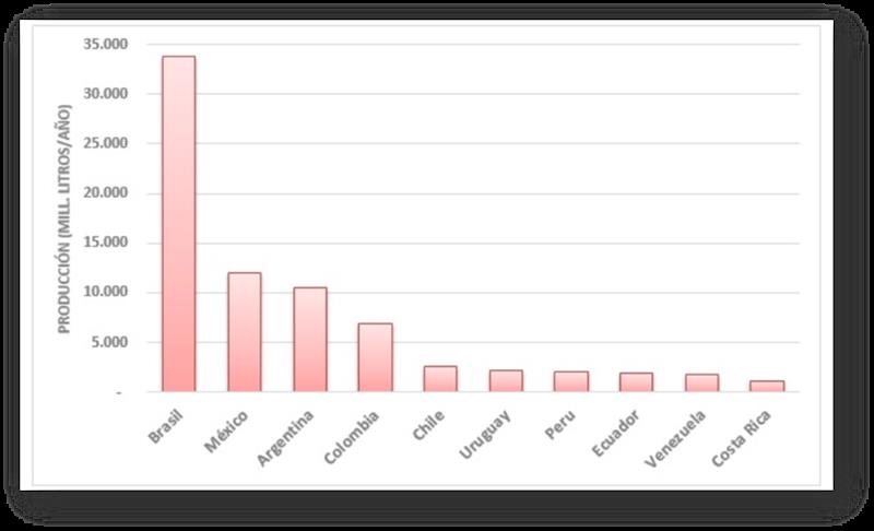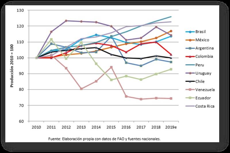 Hay tres países (Brasil, Uruguay y México), con la línea resaltada con un marcador circular, en los que la producción aumentó entre un 10 y 20%, pero con diferencias marcadas entre México (12.006 millones), que tiene tasas de crecimiento pequeñas pero sostenidas, del caso de Brasil (33.840 millones) y Uruguay (2.173 millones), que desde el año 2014 tienen su producción prácticamente estancada, reforzando el comportamiento ya indicado para el conjunto de la región.