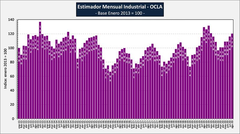 El EMI-OCLA asciende en agosto del 2020 al valor 120,3 que es 3,5% superior al mes anterior y -7,1% respecto a igual mes del año anterior. Desde que se analiza este indicador (92 meses), el promedio de los 7 meses de agosto anteriores llega al valor índice 110,2 vs 120,3 actual (+9,2%) y sólo se observa un valor más alto en 2019 de 129,5.