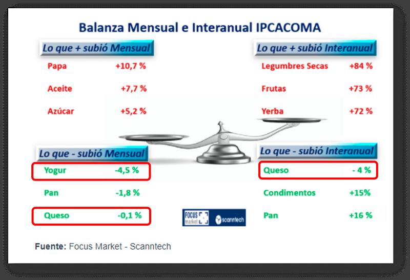 - Lo que menos subió de precio en forma mensual fue: Yogur - 4,5 %, Pan -1,8 % y Queso -0,1 %.