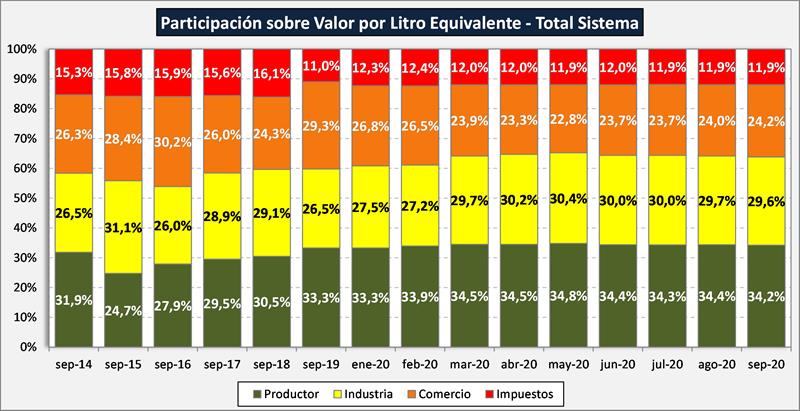 La participación del productor en el total del sistema fue para septiembre del 2020 del 34,2%, 0,2 puntos por debajo del mes anterior (máximo de la serie en junio de 2019 con el 36,0%) y bastante por encima de la media del 30,3%. Una leve baja en la participación en los valores finales de mercado interno y un deterioro de 0,7 puntos porcentuales en la participación de los valores de mercado externo. La participación del productor sobre el valor de salida de fábrica (precio al que vende la industria) fue de 53,6%, igual al mes anterior, y 1,3 puntos por encima de la media de la serie disponible, cabe recordar que la serie histórica para los valores de salida de fábrica tiene una mayor extensión temporal que el resto.