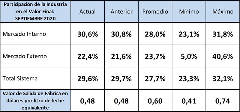La industria reduce levemente en septiembre del 2020; su performance de participación en el mercado interno (-0,2), sube 0,8 puntos porcentuales en el mercado externo, y en el promedio ponderado del mix de ambos mercados, cae la participación 0,1 puntos respecto al mes anterior. La facturación total de salida de fábrica por litro de leche equivalente estuvo en US$ 0,48 (igual que el mes anterior), 12 centavos por litro por debajo del promedio y 26 centavos menos que el máximo logrado en mayo y octubre de 2013, lo cual evidencia los problemas de competitividad que enfrenta el sector, fundamentalmente por el comportamiento de las variables económicas.