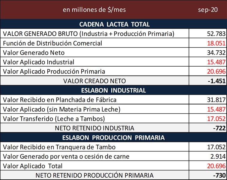 Luego de 16 meses consecutivos con resultados positivos, septiembre es el tercer mes que presenta un resultado negativo en la cadena de valor. El balance sectorial muestra un resultado negativo de $ 1.451 millones, aproximadamente $ 1,40 por litro de leche equivalente. Comparado con igual mes del año pasado el resultado se deteriora en $ 2.540 millones, ya que para él mes analizado el valor del año pasado fue positivo en $ 1.089 millones.