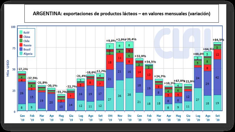 ARGENTINA: potencial de crecimiento y dificultades del sector lácteo 23/11/2020En el período enero-septiembre del 2020, las exportaciones lácteas argentinas registraron un crecimiento de más del 50% con respecto al año anterior. El sector agroalimentario representa dos tercios de las exportaciones y, por lo tanto, es vital para la economía del país. Sin embargo, las exportaciones de leche y productos lácteos aumentaron hasta 2013 alcanzando un valor de 1.600 millones de dólares, y luego se redujeron significativamente a 548 millones en 2019 (Fuente: IHS). US$ 1.784 millones y US$ 928 millones (Aduana), respectivamente. La leche y derivados representan una gran oportunidad de exportación de los países latinoamericanos al mercado asiático, China a la cabeza, pero también Malasia, Indonesia, Singapur, Filipinas, Vietnam, Tailandia y por ello el crecimiento de este sector se vuelve fundamental. En 1999, el gran país latinoamericano produjo 10,3 millones de toneladas de leche, lo que equivale aproximadamente al 1,5% de la producción mundial. A pesar de su potencial, en los últimos años la producción de leche argentina se ha mantenido en torno a los 10 millones de toneladas, mientras que en Estados Unidos ha crecido más de un 15% y en Nueva Zelanda un 22%. En el vecino Brasil, la producción de leche ha aumentado un 67% en los últimos 20 años. Economía y política inestables: obstáculos para la eficiencia productiva La inestabilidad de las variables macroeconómicas y políticas argentinas de los últimos 20 años ha obstaculizado enormemente la mejora de la eficiencia productiva. La extrema volatilidad de los precios ha impedido que los agricultores adopten inversiones en alimentación, salud, bienestar animal y gestión empresarial. También ha obstaculizado la modernización de las estructuras tecnológicas lácteas y el desarrollo de una cadena de suministro que todavía es demasiado dependiente de los circuitos de intermediación, que absorben gran parte de los márgenes de rentabilidad. No hay muchos países que tengan el potencial de crecimiento productivo como en Argentina. La mejora de la confianza en las instituciones y un marco macroeconómico definido permitirá nuevas inversiones tanto en el sector agrícola como en el sector de transformación para explotar adecuadamente estos potenciales. ![]() Fuente y Observaciones: los datos de exportaciones de CLAL provienen de IHS Markit y difieren en su magnitud con los datos de Aduana/INDEC por diferentes cuestiones tales como productos y destinos considerados, mes de imputación de las exportaciones y sobre todo la diferencia en consideración del valor origen – destino. traducido por el OCLA del newsletter de CLAL.it por Leo Bertozzi
