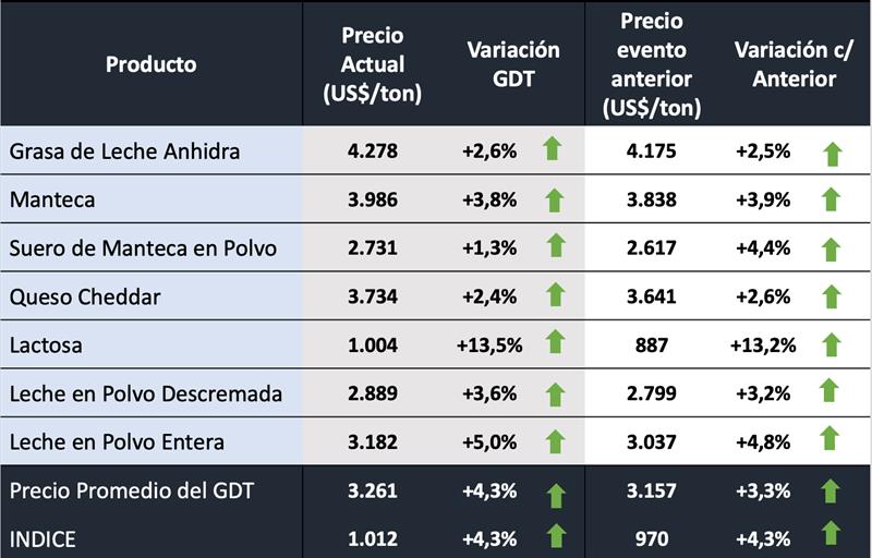 -GDT Price Index indica el promedio del cambio porcentual en los precios para cada especificación, ponderado por la cantidad de cada especificación vendida. GDT proporciona un cambio en el índice de precios de GDT del evento anterior para todos los productos, además de un equivalente para cada grupo de productos y cada combinación de grupo de productos/período de contrato. El índice de precios proporciona un reflejo más preciso de los movimientos de precios entre los eventos comerciales.