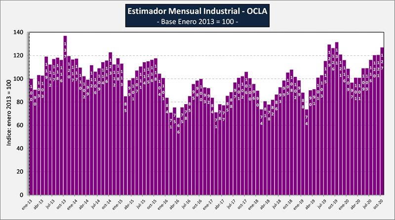 El EMI-OCLA asciende en octubre del 2020 al valor 126,9 que es 1,9% superior al mes anterior (promedio diario) y -3,5% respecto a igual mes del año anterior (la baja es exclusivamente por precios, ya que los volúmenes son superiores en un 5,7%). Desde que se analiza este indicador (94 meses), el promedio de los 7 meses de octubre anteriores llega al valor índice 117,5 vs 126,9 actual (+8,0%) y sólo se observan dos valores más altos en 2013 y 2019.