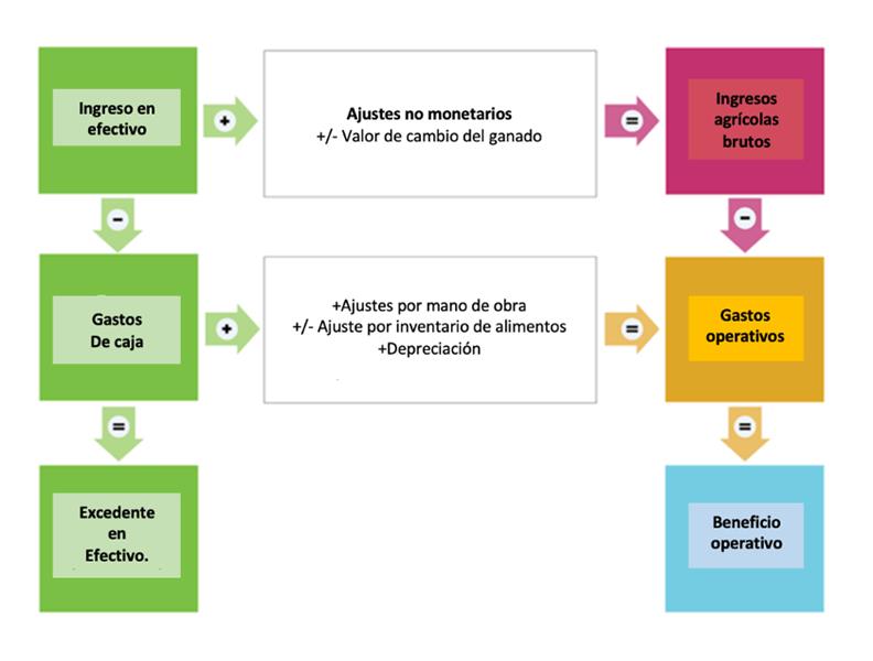 Se calcula comenzando con los ingresos y gastos en efectivo (columna de la izquierda del esquema a continuación) y luego haciendo ajustes no monetarios para calcular la ganancia operativa (lado derecho).