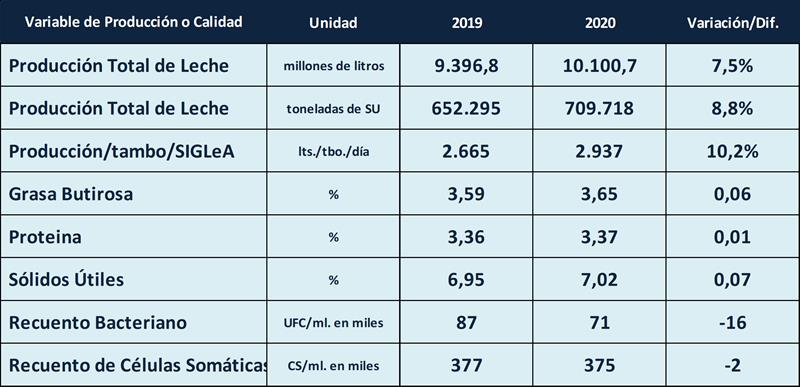 Puede observarse un incremento acumulado de la producción de leche del 7,5%, uno de los más altos de los últimos 20 años. También puede verse que los denominados sólidos útiles (grasa butirosa y proteína), crecieron un 8,8% y la producción que registra SIGLeA del tambo promedio creció un 10,2%. Por último los 4 parámetros de calidad considerados presentan mejoras respecto al año anterior.