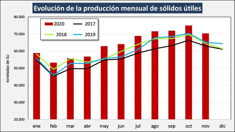 En el cuadro siguiente se evalúa la evolución de la producción de leche (total en litros, en sólidos útiles y por tambo) del acumulado del año 2020 hasta el mes de noviembre, en comparación con igual período del año anterior. De igual forma se comparan los principales parámetros de calidad composicional e higiénico-sanitarios.