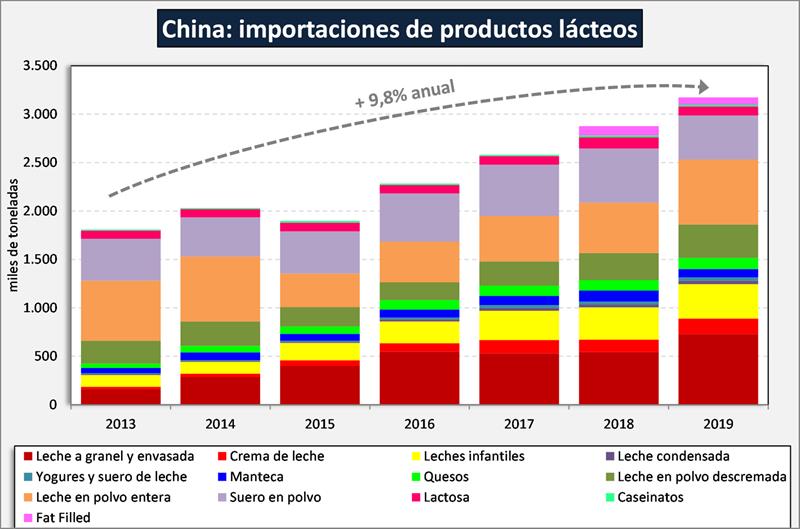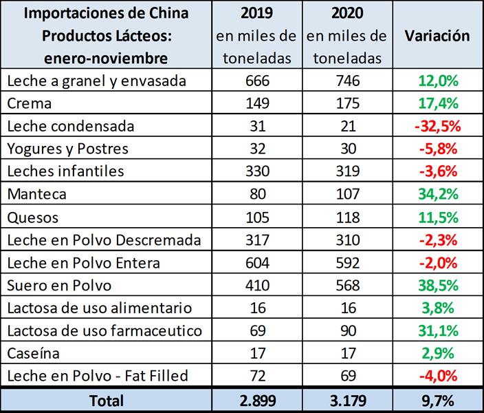 Las importaciones de productos lácteos de China como puede verse en el gráfico de arriba, a pesar de haber variado en la conformación del mix, se recuperaron luego de la caída durante los momentos centrales de la pandemia. Como puede verse ya a noviembre del 2020 conservan la tasa de crecimiento anual que se viene observando en los 6 años anteriores.