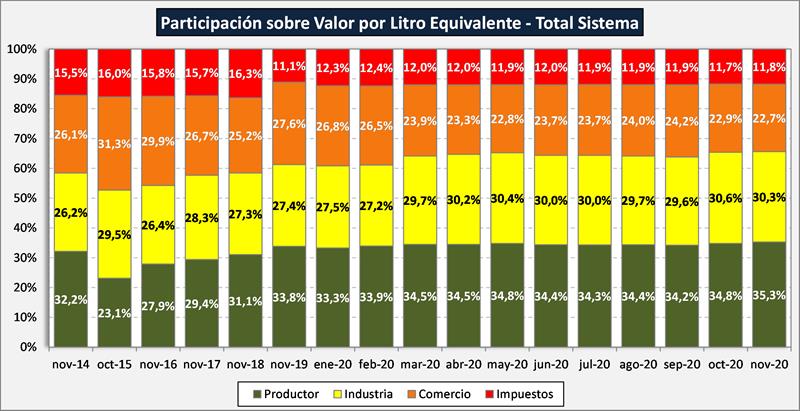 La participación del productor en el total del sistema fue para noviembre del 2020 del 35,3%, 0,5 puntos por encima del mes anterior (máximo de la serie en junio de 2019 con el 36,0%) y bastante por encima de la media del 30,4%. Una suba en la participación en los valores finales de mercado interno (0,5 y llegando al máximo de la serie) y un aumento de 0,4 puntos porcentuales en la participación de los valores de mercado externo. La participación del productor sobre el valor de salida de fábrica (precio al que vende la industria) fue de 53,8%, superior al mes anterior (0,6), encima de la media de la serie disponible, cabe recordar que la serie histórica para los valores de salida de fábrica tiene una mayor extensión temporal que el resto.