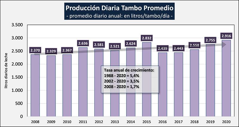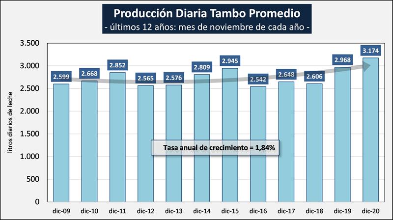 Sobre la base de la producción mensual y la cantidad anual de tambos (SENASA al 31/03/20), podemos inferir el tamaño del tambo promedio, unos 3.174 litros de leche diarios para diciembre del 2020, un 6,9% más que el año anterior. Si evaluamos su comportamiento en el tiempo, a pesar de la disminución en el número de unidades productivas y en el número de vacas, el tambo promedio presenta en el período 2009-2020 una tasa de crecimiento acumulada anual del 1,84%, lo que permite, a pesar de la reducción en las unidades productivas y en el rodeo, el sostenimiento de los niveles productivos agregados a nivel país.