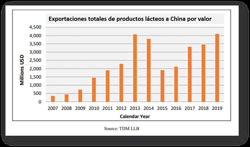 Los productos lácteos son la exportación número uno de Nueva Zelanda a China de cualquier producto, agrícola o no agrícola. Se estima que los envíos de lácteos de Nueva Zelanda alcanzaron otro récord en 2020, y durante los primeros 11 meses de 2020 aumentaron otro 13% en valor respecto al mismo período en 2019.