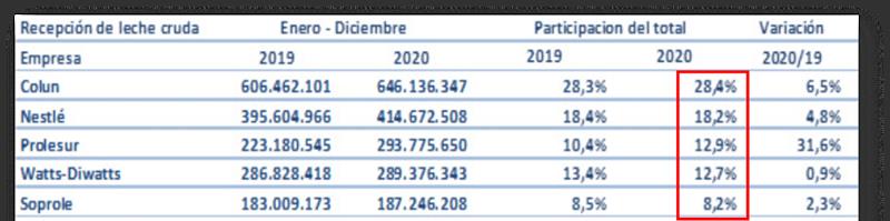 Concentración Industrial 26/2/2021CHILE: ¿Cómo cerró la recepción de leche cruda por empresa en 2020 ? – 25/02/21 Según los análisis elaborados por la Federación Nacional de Productores de Leche - Fedeleche, en base a los antecedentes publicados por la Oficina de Estudios y Políticas Agrarias (Odepa), la recepción de leche cruda de la industria láctea mayor - que reúne a los más grandes procesadores del país - aumentó en un 6,1% durante 2020, con 9 de las 13 empresas con un resultado positivo en aprovisionamiento de materia prima respecto del año anterior. ![]() En base a esta información podemos realizar una comparación de la situación de Argentina respecto a Chile en lo que a concentración industrial se refiere: ![]() Se observa claramente la mayor atomización