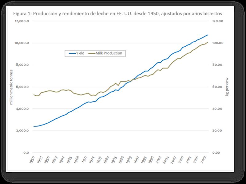 Como se puede inferir del gráfico, en las décadas de 1950 y 1960, los aumentos persistentes en el rendimiento se vieron contrarrestados en gran medida por disminuciones en el rebaño nacional: la producción de leche fue esencialmente constante durante ese período de tiempo. Sin embargo, esto cambió drásticamente a principios de la década de 1970.