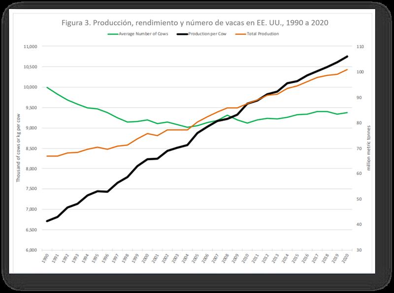 Más recientemente, tanto el milagro como la tragedia han continuado y también se han fortalecido. La Figura 3 ilustra la producción total de leche de EE. UU. y sus dos componentes principales: la producción por vaca y el número total de vacas. Cada variable tiene un patrón y una tendencia distintos.