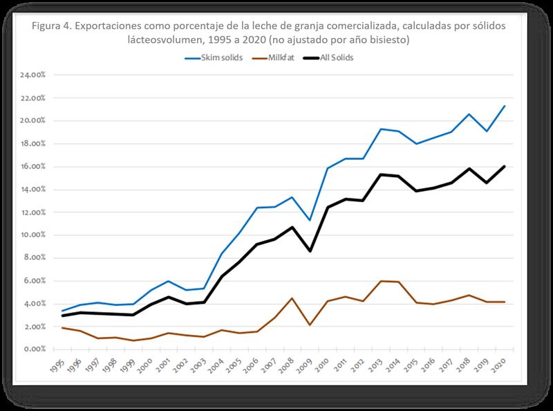 El Acuerdo sobre Agricultura de la Ronda Uruguay entró en vigor en los EE. UU. En 1995. El sector lácteo de EE. UU. Fue un participante bastante reacio en esas discusiones, que completaron efectivamente el desmantelamiento de medio siglo de políticas estadounidenses basadas en mercados cerrados y apoyos de precios internos. Al principio, la industria no estaba completamente segura de si terminaría siendo un exportador neto o un importador neto. Quería ser un exportador neto, pero no estaba en absoluto convencido de que pudiera, o debiera, convertirse en un actor mundial. A principios y mediados de la década de 2000, se hizo evidente que EE. UU. No solo sería un exportador neto, también sería un actor cada vez más importante en los mercados mundiales. Principalmente debido a su gran papel en la exportación de leche y suero en polvo, la proporción del total de sólidos lácteos estadounidenses que terminan en el comercio mundial ha aumentado constantemente desde 2004. Durante la última década, la proporción de todos los sólidos lácteos en los productos lácteos exportados en relación con todos los sólidos en leche de granja comercializada