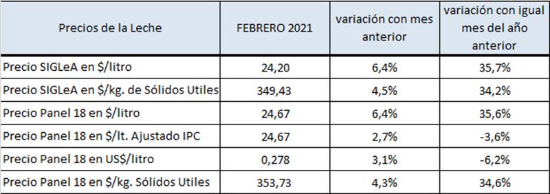 Precios de la la leche al productor - febrero 2021 17/3/2021
