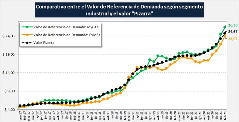 Se observa en el gráfico una mayor capacidad de pago en el mes de febrero/21 del segmento de MyGEs que del segmento PyMEs, $ 26,30 y $ 23,97, respectivamente. La capacidad de pago de las MyGES estuvo $ 1,63 por encima del precio real pagado y el de las PyMEs $ 0,70 por debjao.