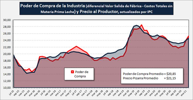 Viendo el precio pizarra liquidado y comparado con la capacidad de pago promedio de la industria, actualizada por IPC, para un período más prolongado, puede observarse que en el largo plazo (salvo oscilaciones temporales) los valores promedio convergen: $ 21,15 por litro de Precio Pizarra y $ 20,85 por litro de Poder de Compra.