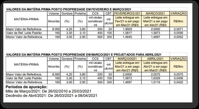 El directorio de Conseleite Minas Gerais se reunió el 14 de abril de 2021, en cumplimiento de lo establecido en el artículo 15 de su Estatuto, inciso I y de acuerdo con la metodología definida por Conseleite Minas Gerais, que considera los precios promedio y el marketing mix de productos derivados practicados por empresas participantes, aprobados y divulgados: