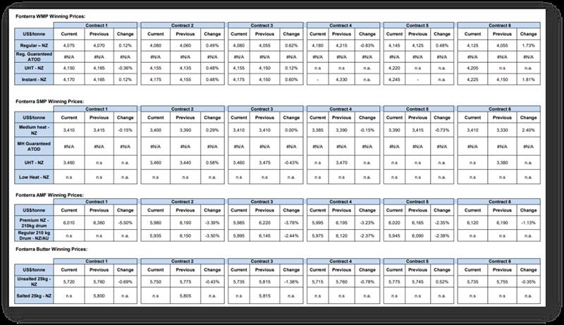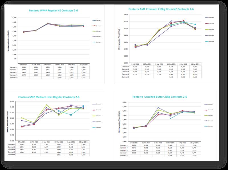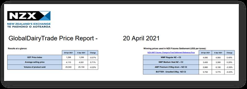 Se adjunta el informe más reciente que muestra los resultados de la subasta del comercio mundial de productos lácteos del 20 de abril de 2021.