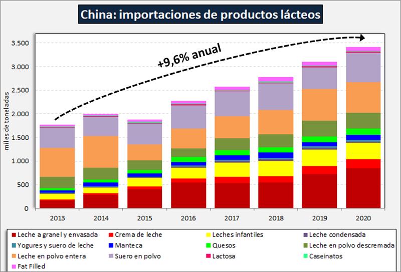 Las importaciones de productos lácteos de China vienen creciendo significativamente en los últimos 8 años (salvo en la crisis de 2015) a una tasa acumulativa del 9,6% anual.