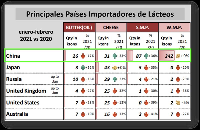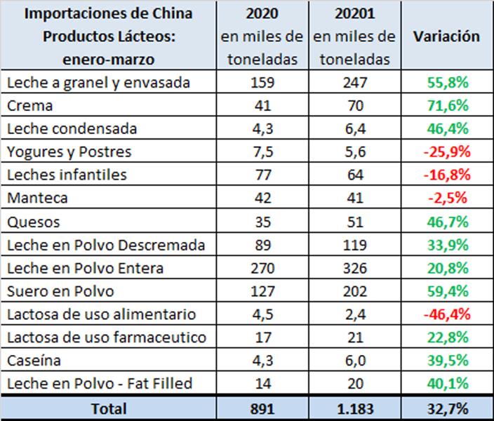 CHINA: importaciones de productos lácteos 28/4/2021