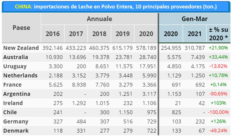 China es el principal importador de Leche en Polvo Entera y su principal proveedor es Nueva Zelanda quien ostenta casi el 95% de participación de ese producto en el gigante asiático.