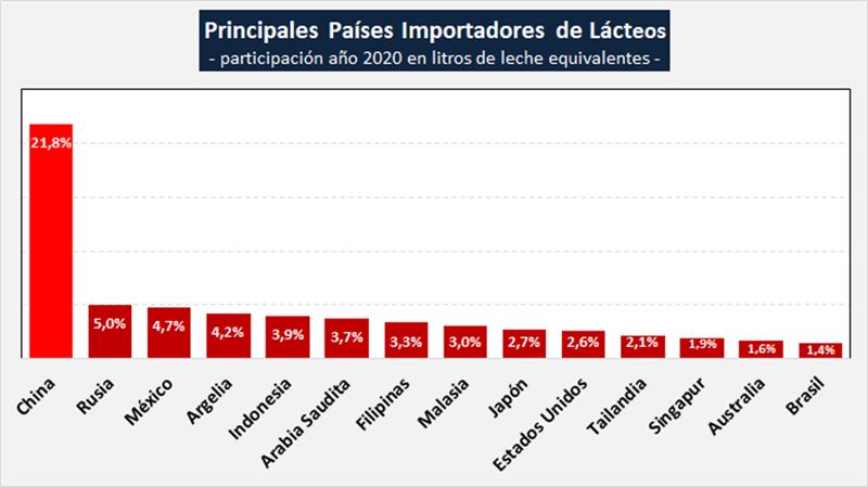 Por último y de acuerdo al Dairy Market Review de FAO (abril 2021) se puede ver en el gráfico siguiente elaborado por OCLA, la incidencia de China en las importaciones mundiales de lácteos medidas en litros de leche equivalentes (21,8%, unos 18 millones de litros de leche equivalentes).