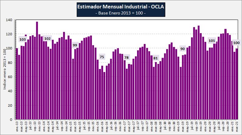 El EMI-OCLA asciende a 99,75 en marzo del 2021, valor 5,1% inferior al mes anterior (promedio diario) y -1,1% respecto a igual mes del año anterior, a pesar que el volumen de producción fue superior en un 4,4%, lo cual evidencia un menor valor unitario de los productos y/o un cambio en el mix. Desde que se analiza este indicador (99 meses), el promedio de los 8 meses de marzo anteriores llega al valor índice 91,1 vs 99,7 actual (+9,4% el actual) y se pueden observar valores superiores en 2013/2014/2020, 103, 102, 101, respectivamente.