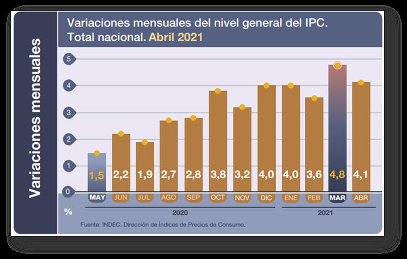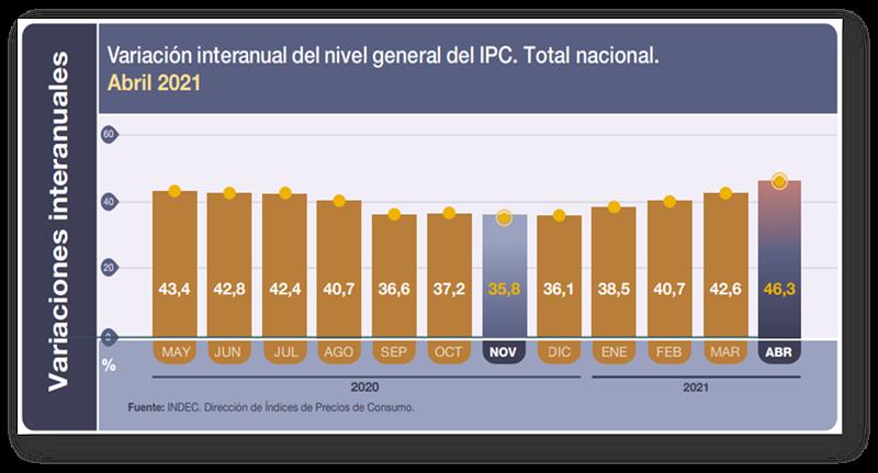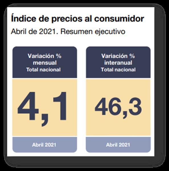 El nivel general del Índice de precios al consumidor (IPC) representativo del total de hogares del país registró en abril una variación de 4,1% con relación al mes anterior y del 46,3% en el interanual.