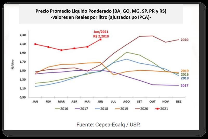 En el primer semestre de este año, el precio promedio de la leche recibida por los productores, R$ 2,05/litro, es 33,6% superior al del mismo período de 2020.