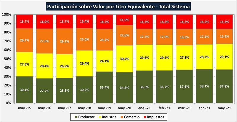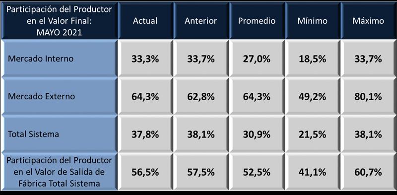 La participación del productor en el total del sistema fue para mayo del 2021 del 37,8%, 0,3 puntos por debajo del mes anterior (el segundo valor más alto de los últimos 8 años) y bastante por encima de la media del 30,9%. Una baja en la participación en los valores finales de mercado interno (0,4 puntos porcentuales) y una mejora de 1,5 puntos porcentuales en la participación de los valores de mercado externo, igualando la media histórica de la serie disponible. La participación del productor sobre el valor de salida de fábrica (precio al que vende la industria) fue de 56,5%, 1 punto por debajo del mes pasado y 4 puntos encima del promedio de la serie (52,5%). Cabe recordar que la serie histórica para los valores de salida de fábrica tiene una mayor extensión temporal que el resto.