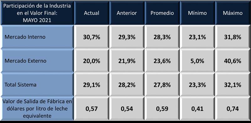 La industria mejora en mayo del 2021 su performance de participación en el mercado interno (1,4 puntos), en el mercado externo deteriora su importancia relativa (1,9 puntos) y en general mejora en el total del sistema 0,9 puntos. La facturación total de salida de fábrica por litro de leche equivalente estuvo en US$ 0,57 (+US$ 0,03 que el mes anterior), 2 centavos por litro por debajo del promedio y 17 centavos menos que el máximo logrado en mayo y octubre de 2013, lo cual evidencia los problemas de competitividad que enfrenta el sector, fundamentalmente por el comportamiento de las variables económicas.
