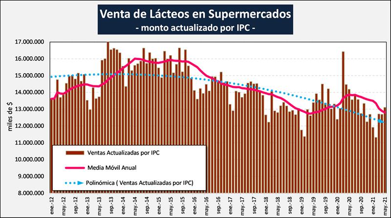 - En moneda constante (ajustadas por IPC) las ventas de lácteos cayeron el