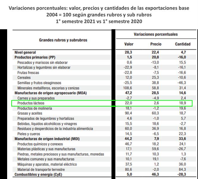 Los Productos Lácteos incidieron en el 1,4% del total exportado en el primer semestre del año, igual participación que la obtenida en igual período del 2020.