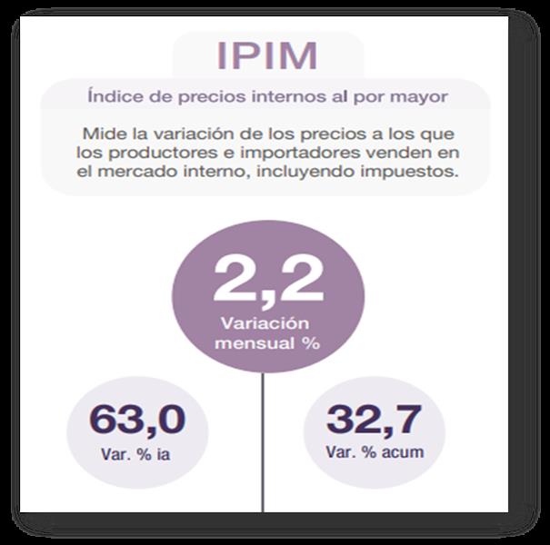 El nivel general del índice de precios internos al por mayor (IPIM) registró un aumento de 2,2% en julio de 2021 respecto del mes anterior, un incremento del 32,7% en el período ene-jul y acumula una suba del 63,0% en los últimos 12 meses.
