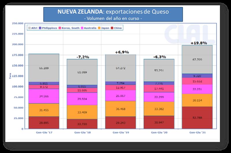 Para Nueva Zelanda se consolida la tendencia positiva en las exportaciones de queso, que cierra el primer semestre de 2021 con 197.854 toneladas (+19,8% respecto al primer semestre de 2020), destinadas principalmente a China y otros países asiáticos.
