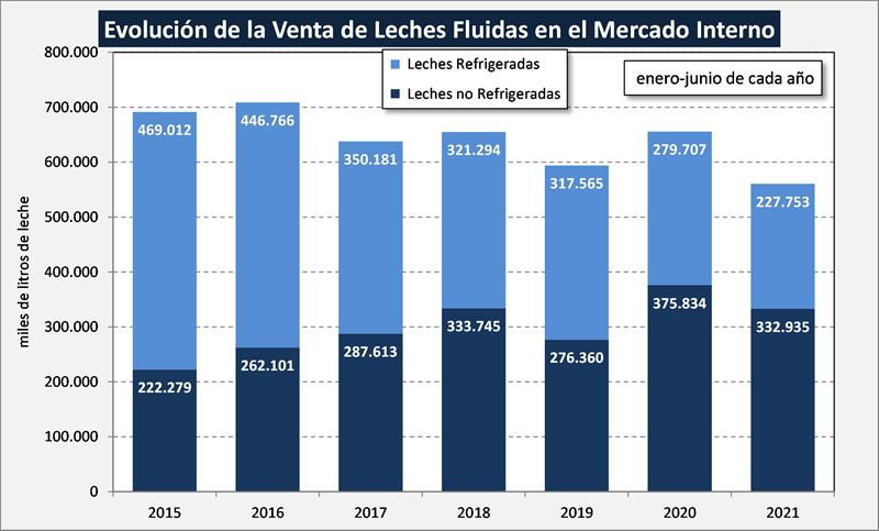 En el gráfico siguiente se presentan las ventas (en miles de litros) del período enero-junio de cada año de leche fluida (refrigeradas y no refrigeradas), donde se puede ver por una parte como van creciendo en participación las leches no refrigeradas en detrimento de las leches refrigeradas, además que la fuerte caída de este año es producto de comparar con una base alta del año pasado donde hay efectos del fenómeno “pandemia/cuarentena”. Una situación similar ocurre para las leches en polvo tanto enteras como descremadas.