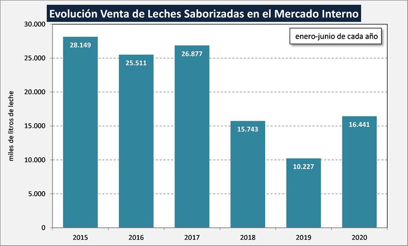 Por otra parte en el gráfico de abajo se ve, cómo productos como las leches saborizadas y chocolatadas que presentan una muy alta tasa de crecimiento en el primer semestre del 2021 (60,8%), es sólo por efecto de comparar con un año como el pasado, donde las ventas fueron muy bajas.
