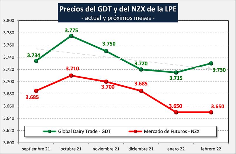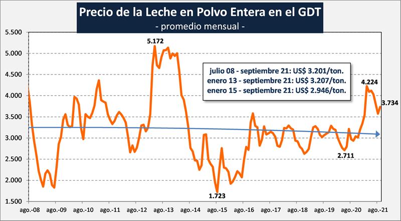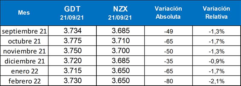![]() En el gráfico superior podemos observar la evolución promedio mensual de las cotizaciones del Global Dairy Trade (GDT) desde julio 2008 a septiembre 2021. En los primeros meses de éste año asistimos a una fuerte suba del precio de la leche en polvo entera (LPE) que llegó a US$ 4.224 luego comenzó sistemáticamente a disminuir el precio hasta los US$ 3.552 de la segunda subasta de agosto (-15,9%), y en la primer subasta de septiembre sube a US$ 3.691 y en la de hoy se consolida la suba, alcanzando los US$ 3.777/ton. Los valores de las 18 subastas de 2021 son en promedio (US$ 3.828), los mayores luego de 2013 (US$ 4.677), con lo cual mantienen al mercado externo en este producto, como atractivo para los exportadores, ya que se ubican también bastante por encima de la media histórica que está en torno a los US$ 3.200/ton. ![]() Los precios actuales y futuros del GDT pueden verse tanto en el cuadro superior como en el gráfico de abajo y están comparados con los precios que arroja el mercado de Futuros del NZX, que en los últimos meses venía con una diferencia importante a favor al GDT, en las últimas cotizaciones los valores son más parecidos y ambos marcan una tendencia levemente decreciente. ![]() Cabe resaltar que los precios en general de las commodities lácteas y que como dijimos más arriba, están por encima de la media histórica, no se venían logrando para las exportaciones de Argentina, con lo cual, si esta última suba repercute en los precios de exportación de nuestros principales productos, el mercado externo vuelve a ser atractivo, sobre todo ahora que estamos cercanos al pico de máxima producción, pero con los atenuantes que venimos mencionando (y que no nos cansamos de repetir), que a estos precios hay que detraerles los derechos de exportación (9,0% par LPE), agregarle reintegros fuertemente disminuidos y sobre todo, convertirlos a pesos por un tipo de cambio oficial que lleva varios meses con un fuerte retraso respecto de los índices inflacionarios (el dólar se valoriza alrededor del 1% mensual y la inflación crece el 3%, lo que implica un retraso en los últimos doce meses del 20%) . elaborado por el OCLA con información del NZX, GDT y EMMO